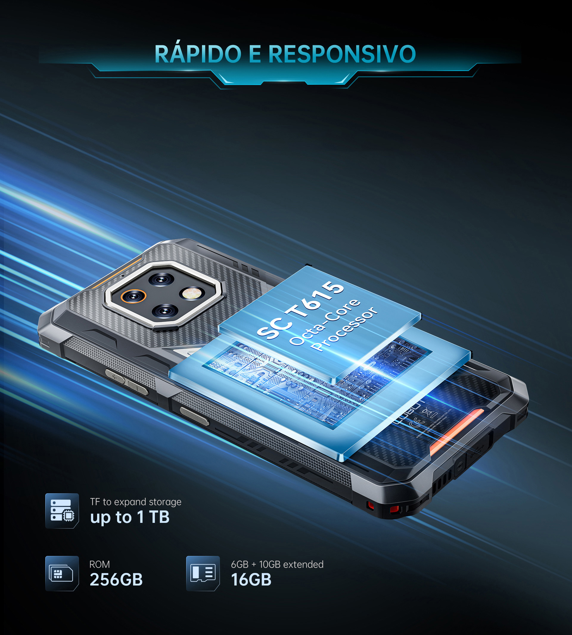 Com o processador Octa-Core SC T615 e até 16GB de RAM (6GB + 10GB expansível), o ES 3 encara multitarefas, mídias e aplicativos com facilidade. Guarde tudo com 256GB de armazenamento interno, expansível até 1TB.