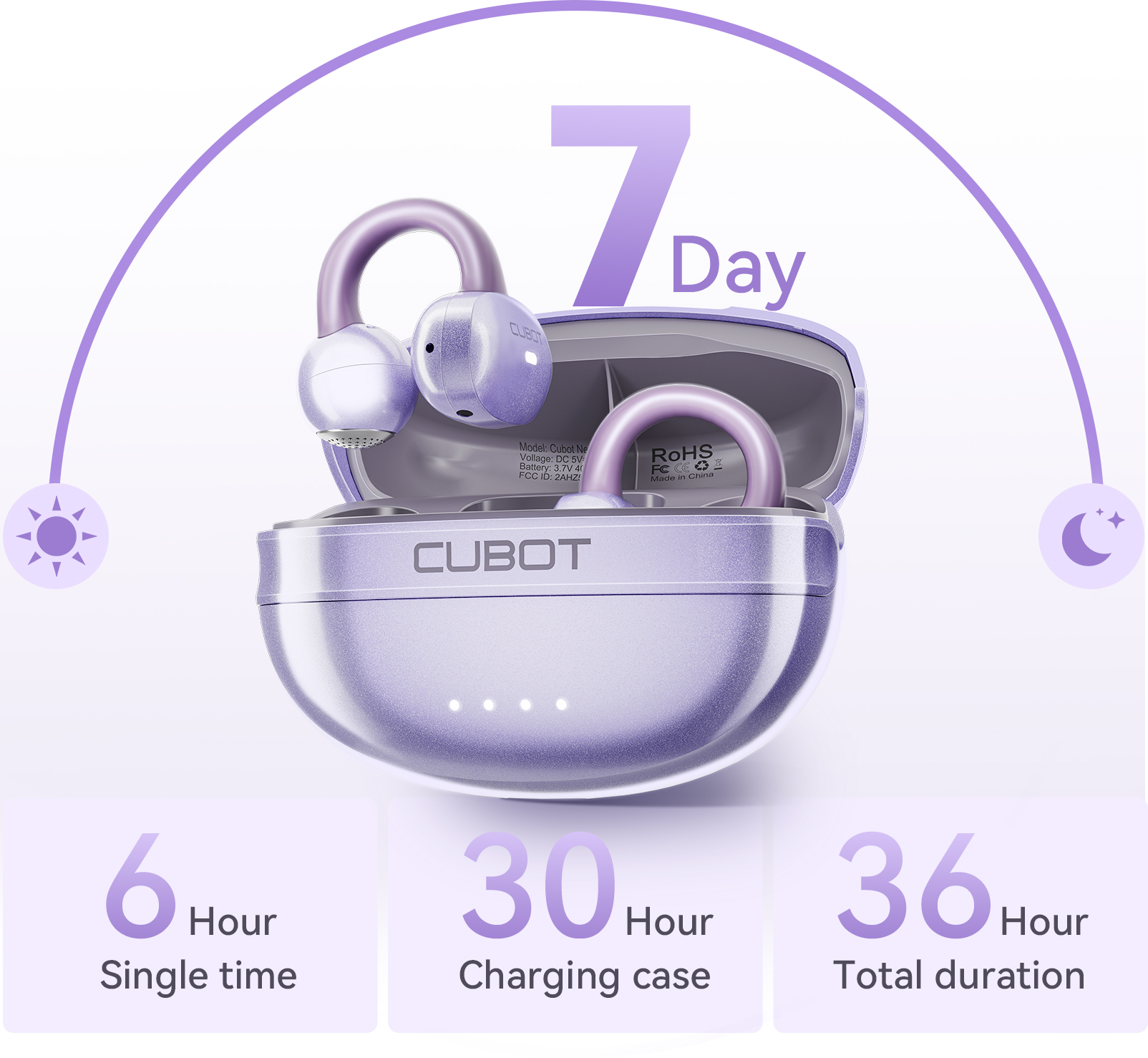 Cada fone vem com bateria de 40 mAh, reforçada por um estojo de carregamento USB-C com 400 mAh. Curta até 7 dias de energia com uma única carga — feito para acompanhar seu ritmo, não te limitar.
